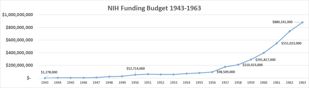 The NFIP demonstrated a strong need for and public interest in providing funds for research support. It wasn’t until the 1950’s, around the time of the effort to fund a vaccine for polio, when the government started to substantially increase funding for the National Institutes of Health when it went to $52.7 million a 50 fold increase since 1943. This investment doubled by 1957, and doubled again in only two years to $210 million in 1959. By 1963 the investment in biomedical research had increased another 4 fold to $810 million. In 2020 that research investment has reached $46 billion, a clear indication that government funding of research is critical. (2) These increases were mostly driven by influential citizen advocates of funding for particular diseases such as polio, tuberculosis, malaria, muscular dystrophy, alcohol and drug addiction, heart disease, diabetes, kidney disease, etc. More recently continued concern about AIDS, ALS, depression and other behavioral disorders, and emerging infectious diseases have encouraged further increases in funding, while the constituencies funded, the major academic medical centers and other research institutions, have fought to maintain and further strengthen funding.