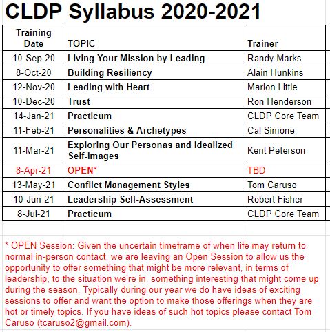 We are pleased to announce our third year of the Community Leadership Development Program (CLDP) – formerly the Community Leadership Training Program (CLTP). We will continue to have our sessions on the second Thursday of each month, 7 to 9 pm ET., from September 2020 through July 2021. You can find a summary of this year’s schedule below. In this (CLDP) Syllabus for the 2020-2021 Season link, you can also find descriptions of each session.