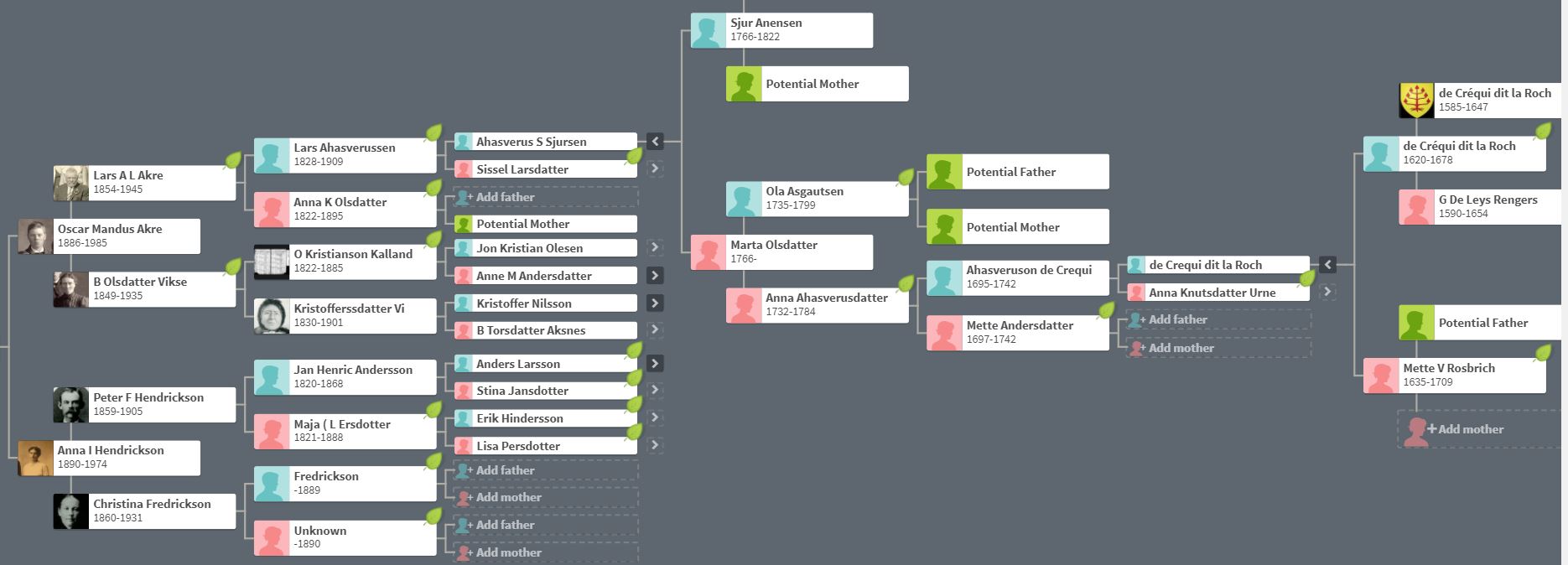 - Ahasverus de Créqui dit la Roche (born: 1971), Cadet, married Anne Knutsdatter Urne on 19 May 1695 in Kvitsoy, Norway. This son by his second wife is my Norwegian 5th great grandfather, an ancestor of Lars Larson Akre who immigrated to Newfolden, Minnesota where he established a homestead and had five children, one, Oscar Akre who would be my mother’s father.
