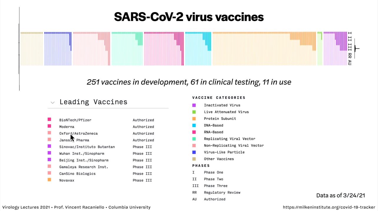 It so happens that Vincent Racaniello at Columbia University has an excellent lecture from his Virology course on vaccines,2 in which he talks about SARS CoV2 (COVID-19) vaccines, both approved and in development (from 54:46 min into the lecture). The entire lecture is worth your time to learn more about they types of vaccines being developed as he explains each type in detail. Elsewhere I have recommended this entire Virology Course.2