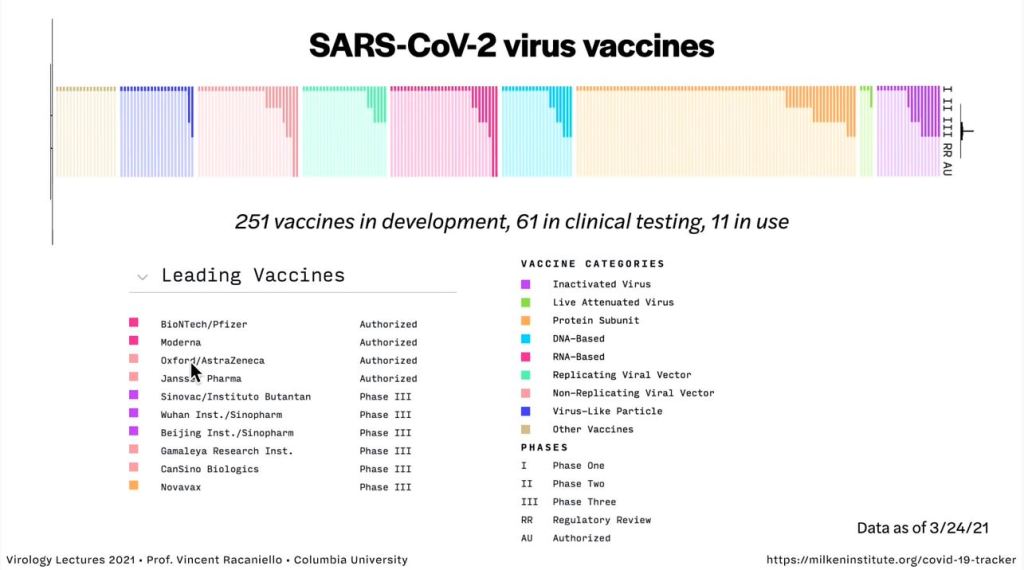 Above is the key slide from this1 lecture (source: The Milken Institute) showing the status of SARS-CoV2 virus vaccines that are in development. Each of the vaccine categories are described in this lecture.