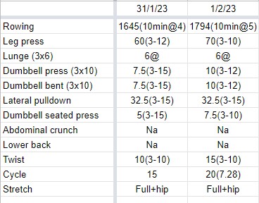 Exercise Routine. My coach recommended warm up (rowing), leg push, lunge, horizontal push and pull, vertical push and pull, lower back, crunch and twist exercises, as well as the general idea of cycling while listening or watching something. So I go to the gym around 10 – 11 am and frequently Agnes goes with me, though she goes to a different, less expensive gym. I start with 10 minutes of warm up rowing, then I do the leg and arm exercises he recommends, trying to increase reps from 10 to 15 in each set of three per exercise. Once I have increased the reps to 15 per set enough times, then I move to the next weight level at 10 reps per set. The coach made several points about how I can progress with lunge exercises, for instance adding a weight to the side that is doing the bending and raising. I want to eventually move away from using a support, which is an issue as I start up doing lunges. After I do the sequence of exercises then I do from 15-25 minutes of cycling to get more aerobic exercise, and I push myself to build up a sweat.